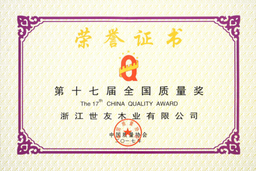 因質量標志性成果在行業中突出,世友木業廣受行業內外的好評,滿載“亞洲質量卓越獎”、“中國質量技術獎”、“全國質量獎”、“全國質量標桿”、“全國優秀質量管理小組”等9個質量獎榮譽,展現了世友木業在木地板領域的專業實力和過硬品質,持續推動行業高質量發展。